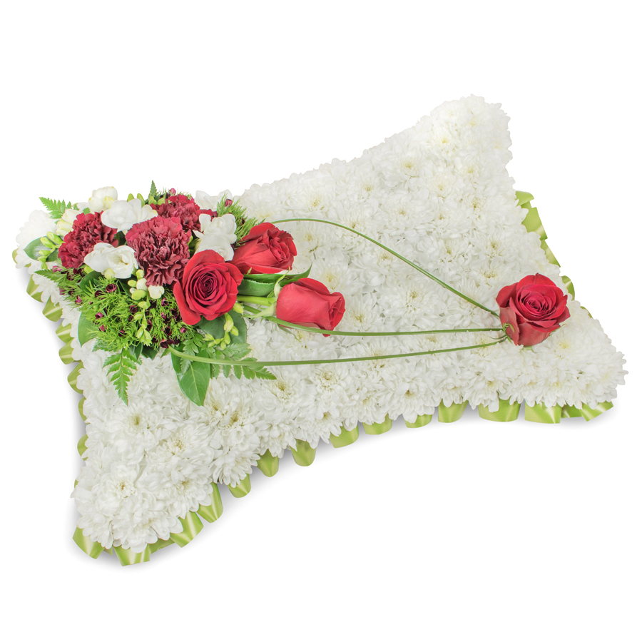 Express your deepest condolences with the Sincerest Sentiments Cushion from Flowers Perivale. This elegant floral tribute features a lush base of white chrysanthemums, beautifully accented with rich red roses, delicate white freesias, dark red carnations, dianthus and flowing bear grass for a soft, graceful finish. Expertly arranged into a classic cushion shape, it offers a tasteful and heartfelt way to honour a loved one and bring comfort to family and friends. Approximate dimensions are 45cm (18") in length, 60cm (24") in width and 12cm (5") in height, making it a substantial and striking sympathy display for funerals, memorials or remembrance services. Our florists in Perivale carefully select each bloom for freshness and quality, leaving protective guard petals on the roses to ensure they arrive in perfect condition; simply remove these outer petals before display. As some flowers are seasonal, we may substitute blooms with equal or superior quality alternatives in similar colours and style, ensuring your tribute always looks beautiful. Rely on Flowers Perivale for a premium, reliable sympathy cushion with prompt local delivery when it matters most.